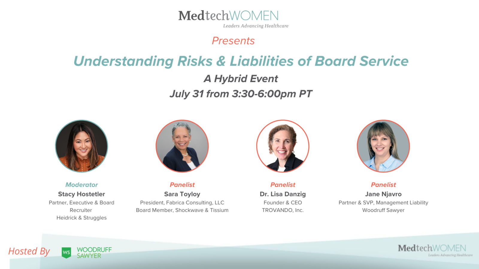 Join us in person or virtually for “Understanding Risks and Liabilities of Board Service” curated by MedtechWOMEN’s Board Development Committee and hosted by Woodruff Sawyer at their office in San Francisco.